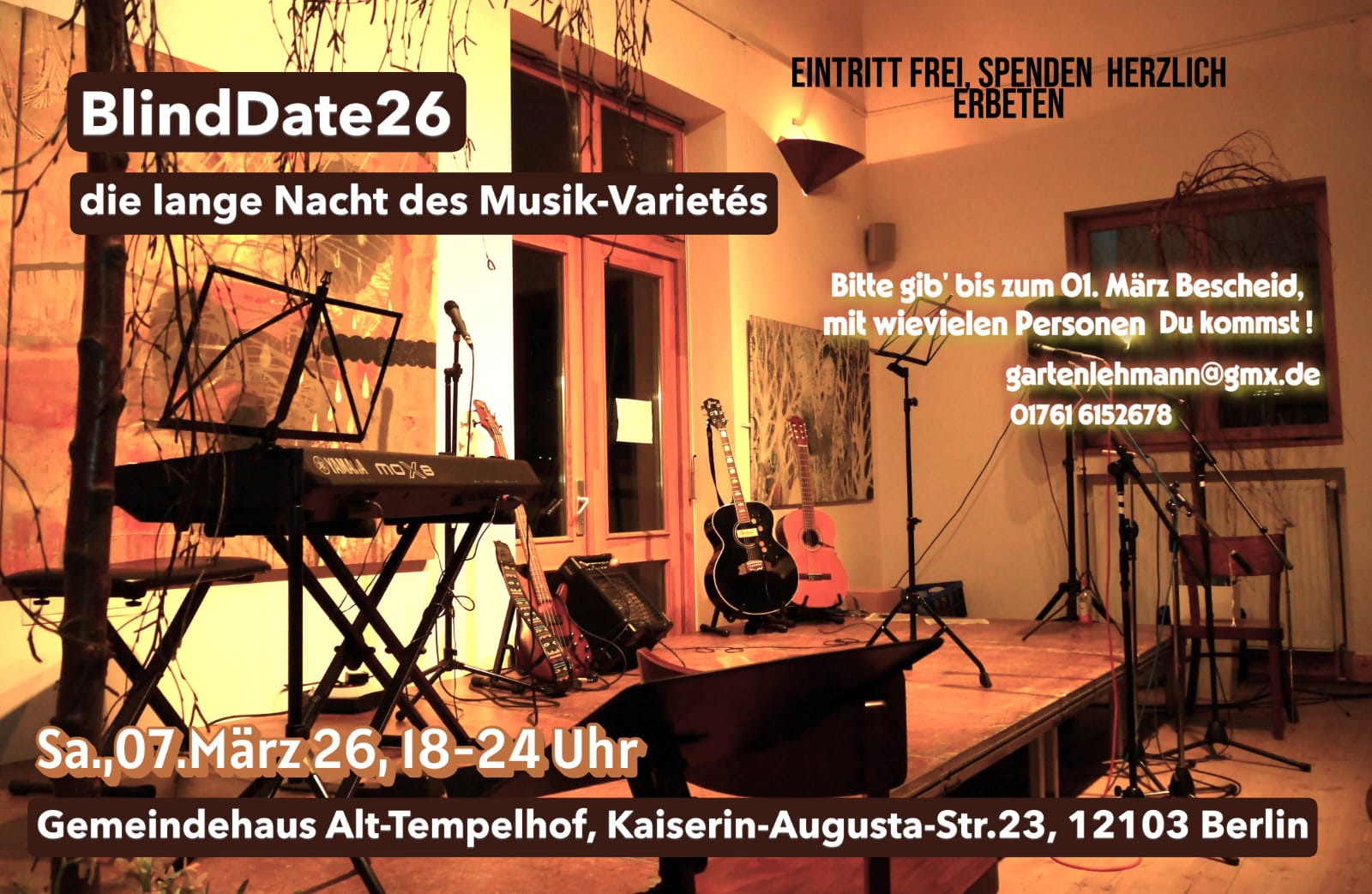 Bitte kommt rechtzeitig, mindestens 30 Minuten vor Beginn. Der Abend ist gut besucht. |